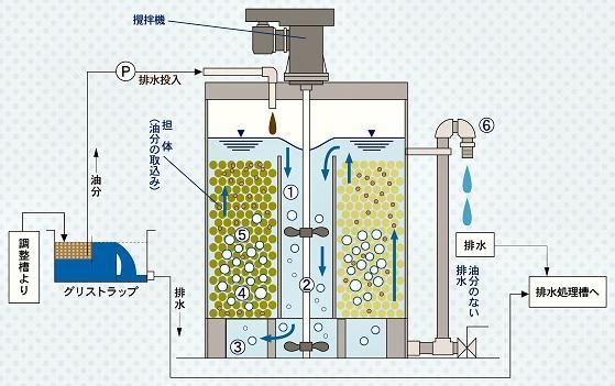 | ◎装置構成がシンプルなのでスペースを取りません。 ◎油分は、微生物により 有機分解 されるため 効率的 です。 ◎ ランニングコスト は、攪拌機の 電気代 のみです。 ◎従来の油分の 清掃・処理 が 少なく なります。 ◎油分のみでなく処理過程に 泡の発生する汚水の処理 に |