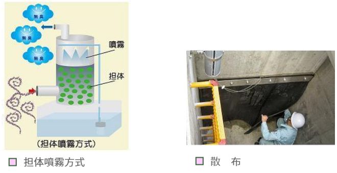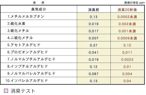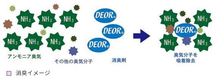 | 香り等を用いて悪臭をマスキングするタイプではなく、悪臭の 原因に作用して臭気低減を行います。 |