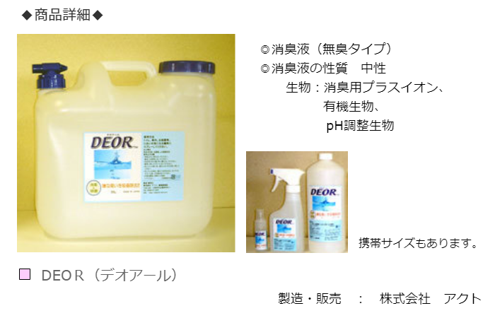 | DEOR(デオアール)は、従来の消臭剤とは違う、臭気を 『吸着』させる技術があります。 有害物質を発生させずに臭いを除去します。 |