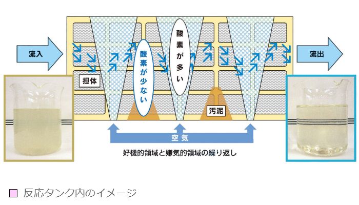 | ◎微生物が付着しやすい形状で、すばやい生物膜の増加を実現 ◎汚水との接触面積が多く、高い分解処理効率を実現 ◎高い空間率が、詰まりのない安定した水処理の連続化を実現 ◎負荷変動に強く、汚泥の発生量の減少化を実現 ◎ランニングコストの低減化を実現 ◎臭いの発生はほとんど無し |