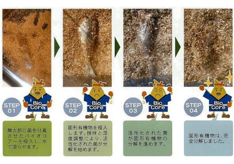 | ●STEP-01 『無太郎に菌を付着させたバイオコアーを 投入し、水で湿らせます』 ●STEP-02 『固形有機物を投入します。攪拌と湿度調整 により、活性化された菌が分解を始めます』 ●STEP-03 『活性化された菌が固形有機物の分解を 進めます』 ●STEP-04 『固形有機物は、完全分解しました』 |